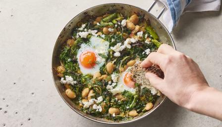 This vibrant green shakshuka is a great option for a healthy brunch or lunch as it’s packed with good stuff and doesn't take long to pull together. You get protein from the eggs and beans, plus vitamins and fibre from the green veggies. Serve with crusty bread if you want it to serve two.
