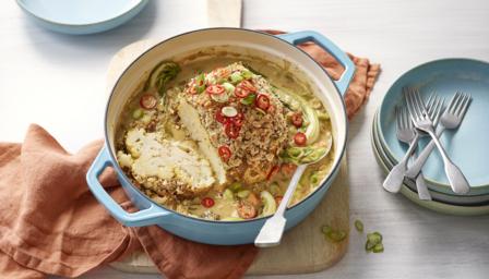 Scatter the peanut topping over the cauliflower, lightly pressing it in. Gently lift the cauliflower into the sauce using a large fish slice. Scatter the soya beans and reserved cauliflower leaves around the cauliflower in the sauce, and put the casserole dish in the oven for 10 minutes, until the topping is crisp.