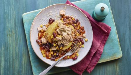 A jacket potato filled with spicy beans and tuna makes a filling meal whatever time of the day. Using beans already combined with a chilli sauce, means you don’t need to buy a range of different spices to make this dish. It’s also delicious made without the tuna and extra cheese instead.