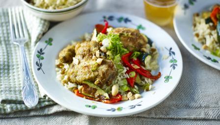 Serve the roasted chicken pieces and roasted vegetables on a bed of the spiced rice. Garnish with a sprinkling of chopped toasted nuts and sliced spring onions. Finish with a little chopped coriander if desired.
