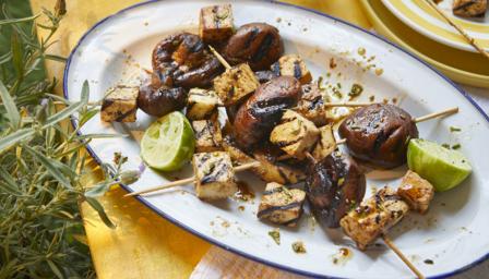 When you have friends round for a barbecue, these paneer and mushroom skewers with a sticky lime, cayenne and rosemary glaze are an irresistible side dish or vegetarian option.