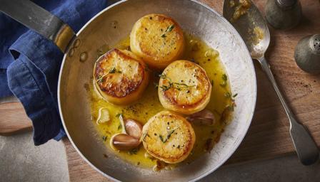 Make your roast dinner super classy with these pommes de terre fondantes, potatoes cut into neat little cylinders and then slowly cooked in butter and stock.