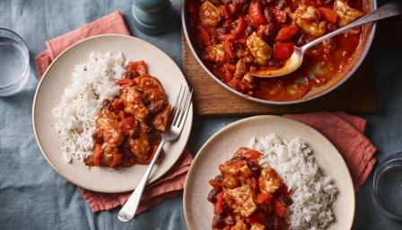 Add the kidney beans, passata and chicken and season with salt and pepper. Give everything a good stir and put the lid on. Turn the heat to low and cook for 15–20 minutes until the chicken and beans are cooked through and the sauce has thickened. Serve the chilli with rice.