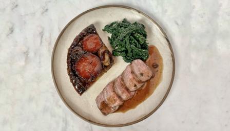 A caramelised root veg tarte tatin provides an impressive backdrop for this roasted venison dish from Saturday Kitchen.