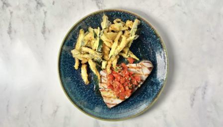 Plate up the tuna with the tomato salsa on top and the courgette fritti on the side.