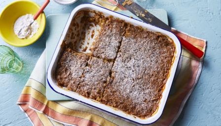 Bake for 75–90 minutes or until a dark crust forms on top and a knife inserted into the pudding comes out clean. Allow to cool a little, then dust with the icing sugar. Slice into pieces and serve warm.