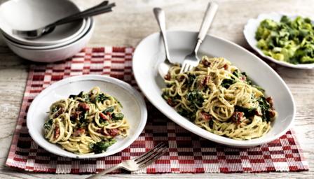 Smoked cheese replaces bacon in this creamy veggie version of spaghetti carbonara. Use sundried tomatoes for a more savoury taste, while semi-dried tomatoes will be sweeter.