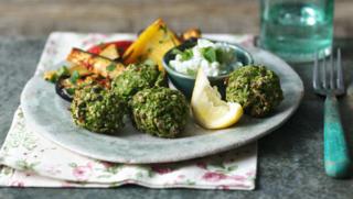 By swapping the traditional chickpeas for soybeans you almost halve the carbohydrate content in these falafels. Traditionally deep-fried falafels can be quite high in saturated fat so these are baked and served with a fat-free dip and roasted vegetables.
