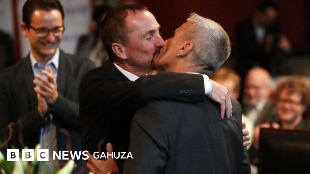 Abagabo babiri bubakanye mu mategeko mu Budage, ku munsi wa mbere wo kwemererwa gushingirana mu mategeko, ku bahuza ibitsina babisangiye.