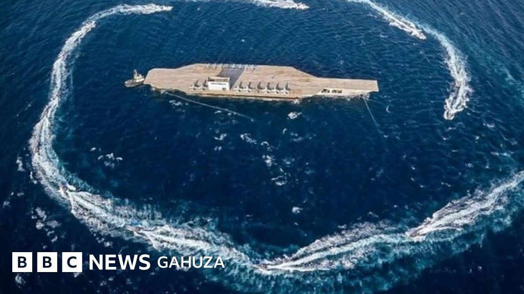 Icyiganano - gisa nk'ubwato bw'intambara Amerika isanzwe ishyira mu mazi yo mu kigobe - kigaragazwa gikikijwe n'indege mpimbano z'intambara aho ubwo bwato buparikwa.