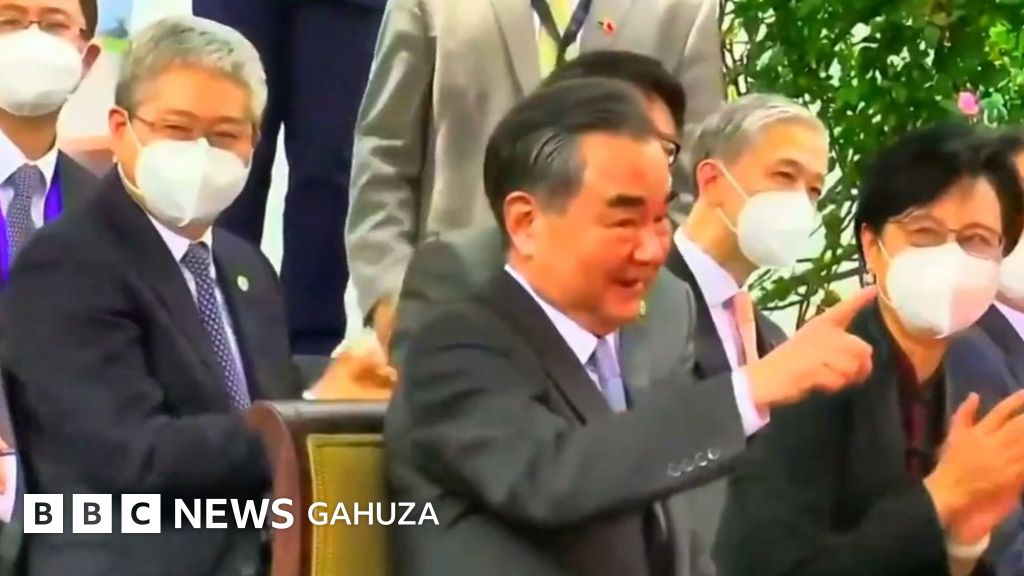 Umushikiranganji w'imigenderanire w'Ubushinwa Wang Yi yaboneka nk'uko yirebanga mu ntumwa yari arongoye, mu gihe abandi bose bari bambaye udupfukamunwa, nk'uko biboneka muri ino reresi: