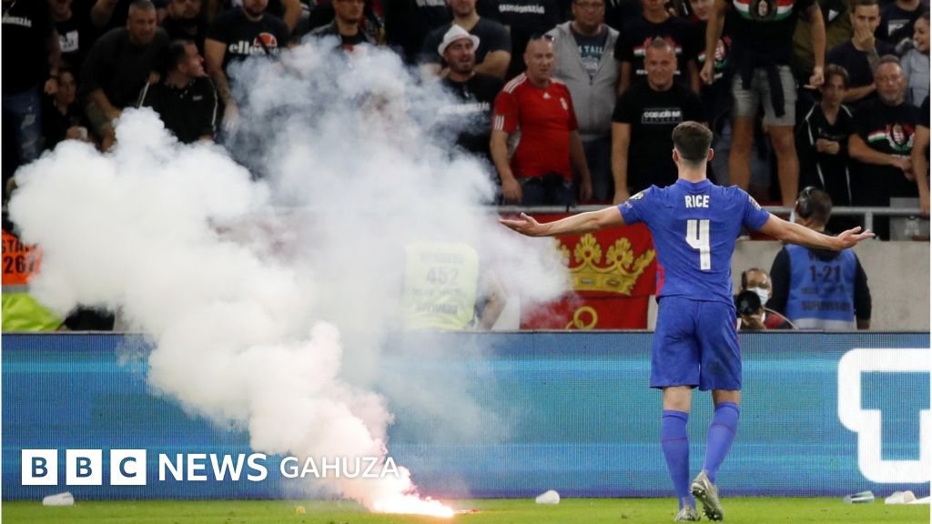 Abakinyi bw'Ubwongereza kandi baratewe ibintu mu gice ca kabiri c'urukino, abafana batera n'ikintu caka kirekura n'umwotsi mu kibuga ca Puskas Arena.
