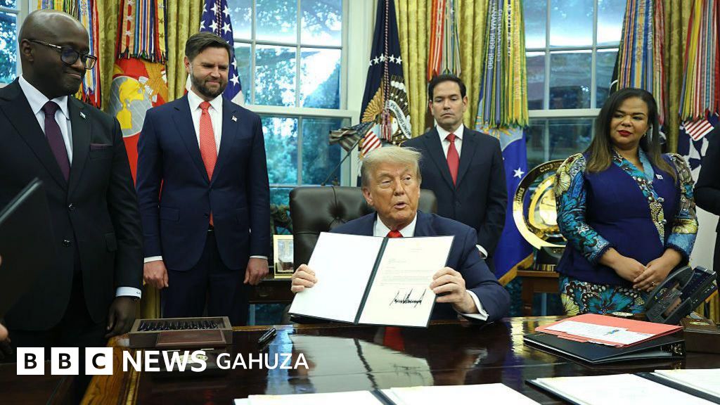Perezida w'Amerika Donald Trump afashe ibaruwa mu ntoki yashyizeho umukono, ashimira impande zombi ubwo yahuraga na Minisitiri w'ububanyi n'amahanga w'u Rwanda Olivier Nduhungirehe na Minisitiri w'ububanyi n'amahanga wa DRC Thérèse Kayikwamba, nyuma yo gushyira umukono ku masezerano y'amahoro. Aha bari kumwe na Visi Perezida w'Amerika JD Vance (wa kabiri ibumoso) na Minisitiri w'ububanyi n'amahanga Marco Rubio. Ifoto yafotorewe mu biro bya perezida w'Amerika (White House), ku wa gatanu, ku itariki ya 27 Kamena (6) mu mwaka wa 2025.