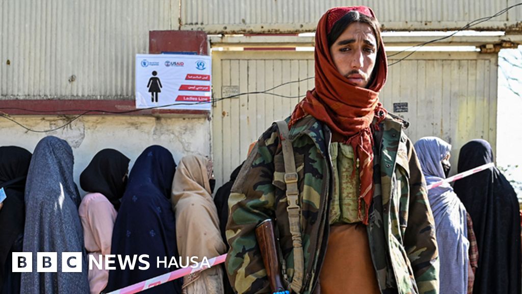 Wani sojan Taliban na gadi yayin da mata sun yi layi a shirin raba abinci na hukumar samar da abinci ta duniya a Kabul