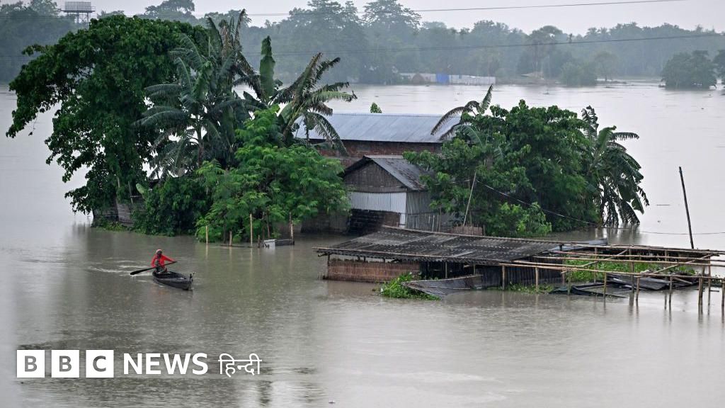 इमेज कैप्शन, असम के मोरीगांव जिले के एक गांव की तस्वीर, जहां भारी बारिश के कारण आई बाढ़ से कई घर डूब गए हैं