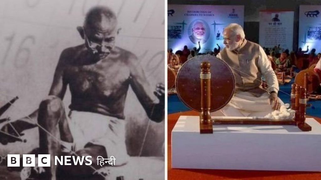 एक तस्वीर में दुबली पतली काया वाला उघाड़े बदन बैठा बुज़ुर्ग लकड़ी के चरखे पर सूत कातता हुआ, तो दूसरी में डिज़ाइनर चरखे के पास डिज़ाइनर कपड़े पहने भरे बदन वाला स्वस्थ और आत्मविश्वास से लबरेज़ प्रधानमंत्री.