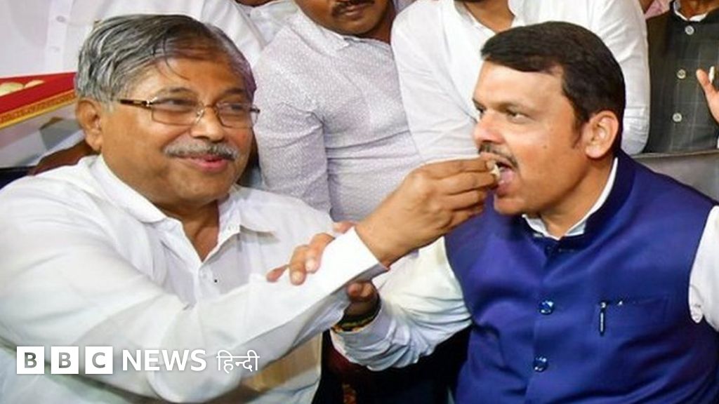 इमेज कैप्शन, देवेंद्र फडणवीस को मिठाई खिलाते महाराष्ट्र बीजेपी प्रमुख चंद्रकांत पाटिल