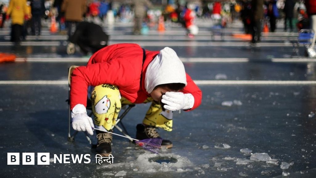 तस्वीरें: बर्फ़ की चादर तोड़ कर मछली पकड़ना