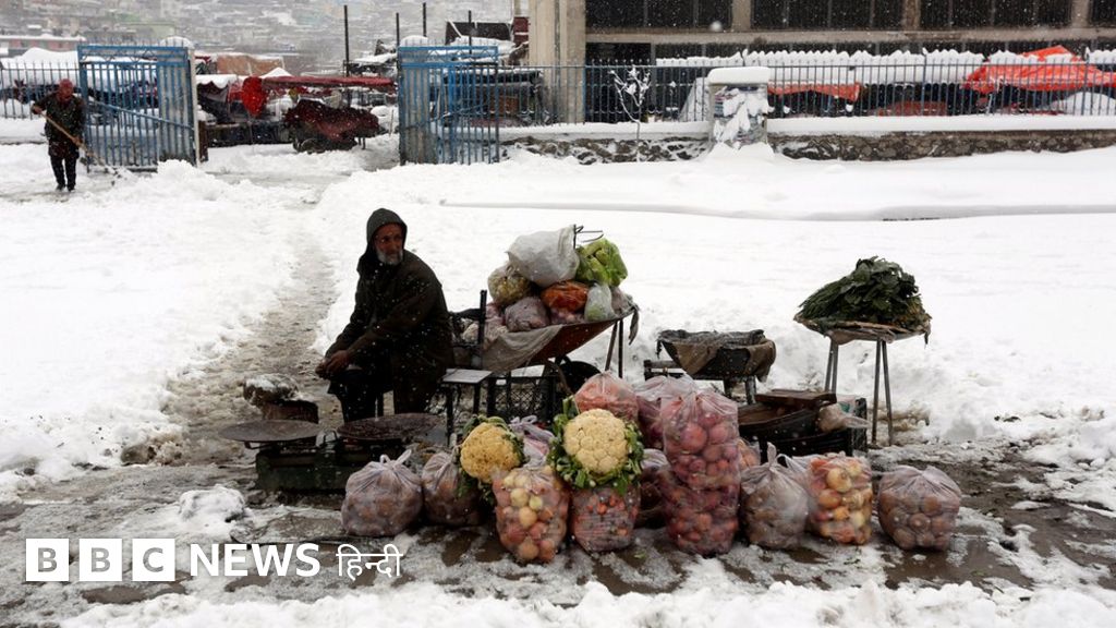 इमेज कैप्शन, बर्फ़बारी वाले दिन सब्ज़ी बेचता एक अफ़गान आदमी