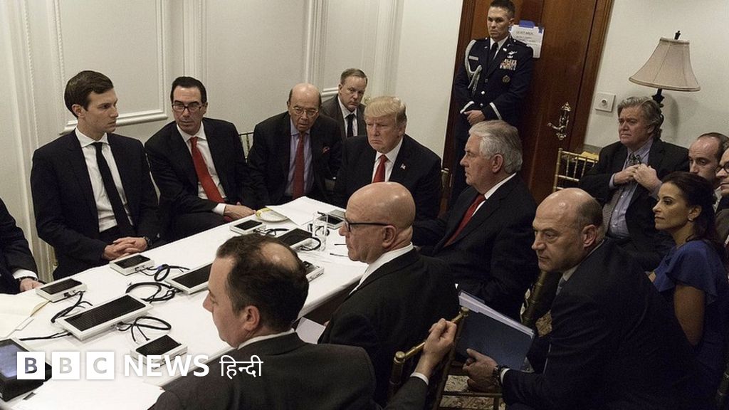 तस्वीर में दिख रहा है कि राष्ट्रपति के दामाद जैरड कुशनर बीच में मेज के पास बैठे हैं और ट्रंप के क़रीबी माने जाने वाले बैनन पीछे बैठे हैं.