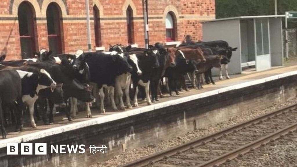 इंग्लैंड के हेवर स्टेशन के प्लेटफॉर्म पर पहुंचा गायों का झुंड