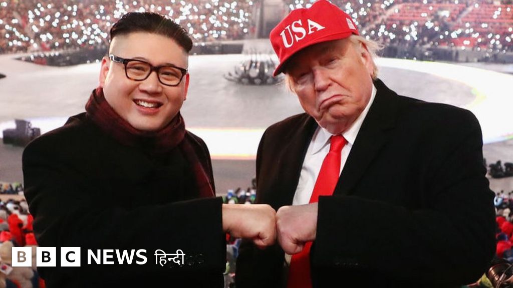 इमेज कैप्शन, प्योंगचांग स्टेडियम के बाहर किम जोंग-उन और डोनल्ड ट्रंप के भेष में पहुंचे दो प्रशंसक. दोनों एक-दूसरे से गले भी मिले