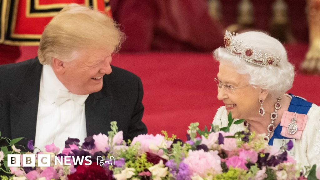 बकिंघम पैलेस में महारानी एलिजाबेथ द्वितीय राष्ट्रपति ट्रंप का स्वागत करती हुई.