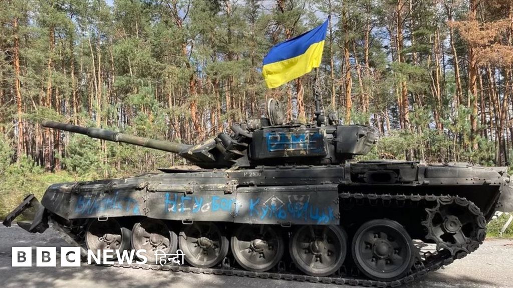 इमेज कैप्शन, रूसी सैनिकों के पीछे छोड़े गए इस टैंक पर यूक्रेन का झंडा लहरा रहा है