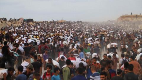 इमेज कैप्शन, ग़ज़ा में सहायता सामग्री पहुंचाने के लिए मंगलवार को 115 ट्रक भेजे गए थे, जिन्हें ज़रूरतमंद लोगों तक पहुंचने से पहले ही लूट लिया गया