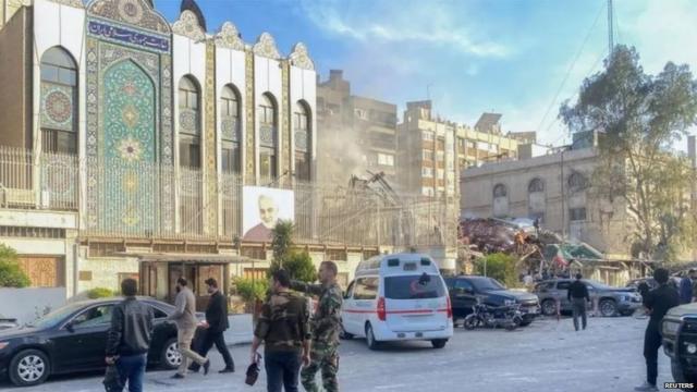इमेज कैप्शन, दमिश्क स्थित वाणिज्य दूतावास के बराबर में स्थित ईरानी दूतावास को किसी तरह की क्षति नहीं पहुंची है