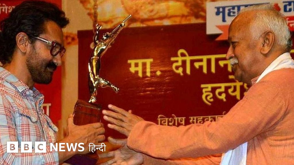 और साथ ही नज़र आ रहे है राष्ट्रीय स्वयंसेवक संघ के प्रमुख मोहन भागवत. लोग सबसे ज़्यादा उस तस्वीर पर चर्चा कर रहे हैं जिसमें भागवत, आमिर को पुरस्कार सौंप रहे हैं.