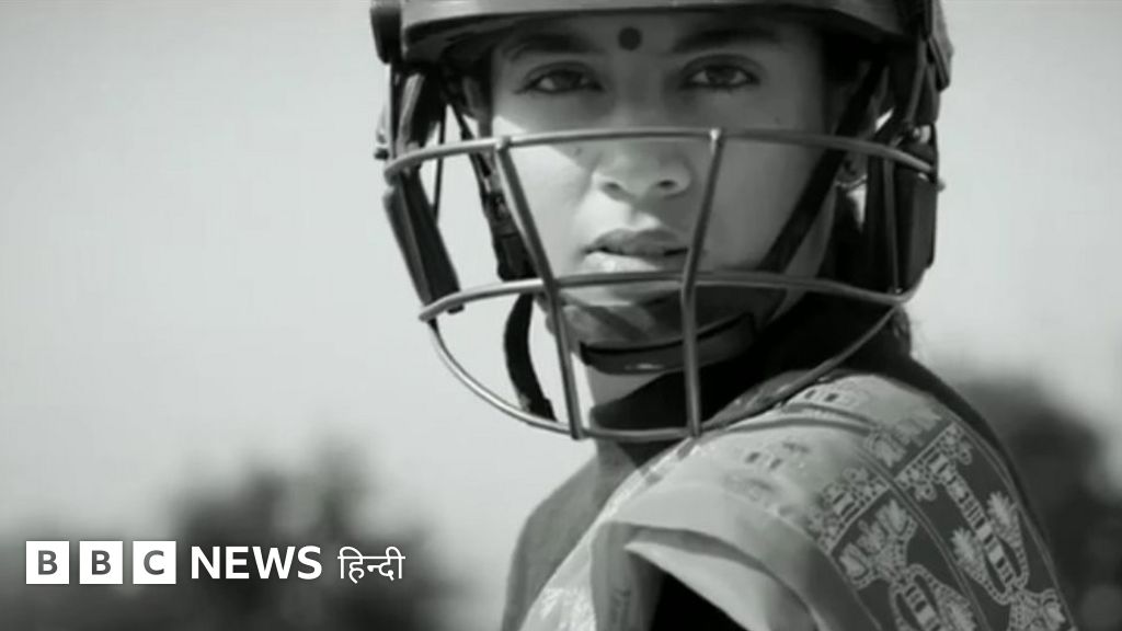 जिसमें वो क्रिकेट ग्राउंड के बीचों-बीच साड़ी पहने हुए दिखती हैं. उनके माथे पर बिंदी है. पैरों में स्पोर्ट्स शूज़ और हाथों में बल्ला है.