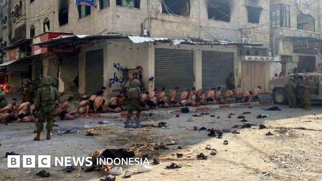 Rekaman video yang diverifikasi oleh BBC menunjukkan sekelompok pria ditelanjangi hingga pakaian dalam, berlutut di tanah, dan dijaga oleh tentara Israel.