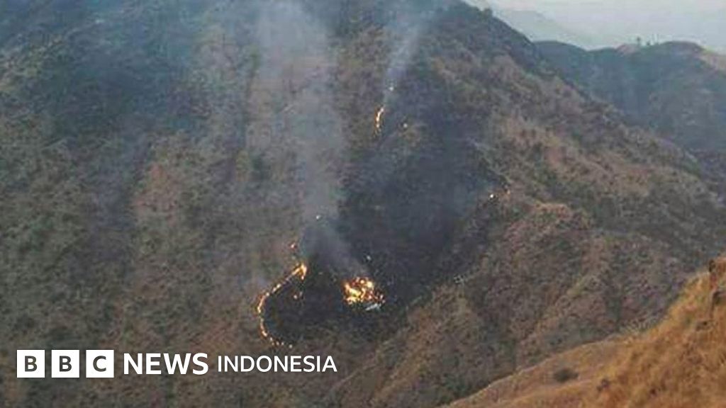 Tayangan TV Pakistan memperlihatkan puing-puing pesawat yang terbakar di satu lembah.