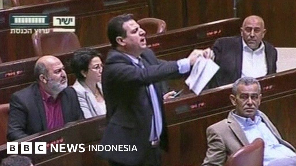 Ayman Odeh, pemimpin Partai Joint List, keluar dari ruangan sesaat setelah merobek salinan RUU.