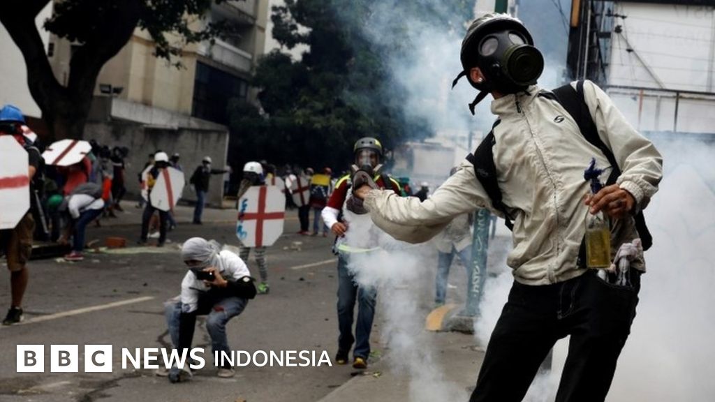 Demonstran yang turun ke jalan pada hari Rabu (3/5) yang sebagian mengenakan bandana dan membawa ketapel - dihadang pasukan keamanan di jalan raya Francisco Fajardo, yang membelah jantung kota Caracas.