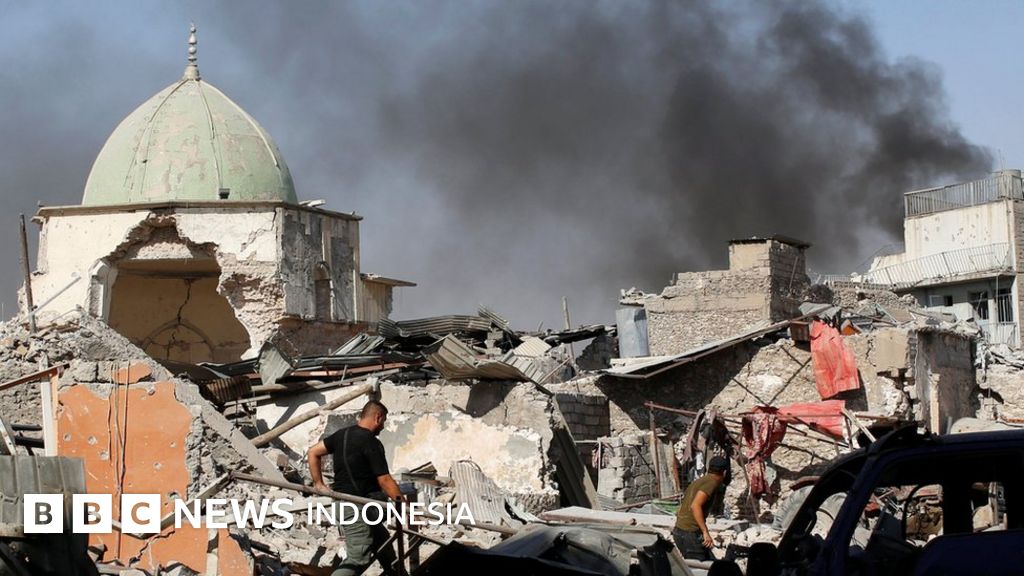 Namun masjid tersebut kini tinggal puing-puingnya karena milisi ISIS meledakkan tempat ibadah tersebut dan juga menara miringnya yang terkenal pekan lalu.
