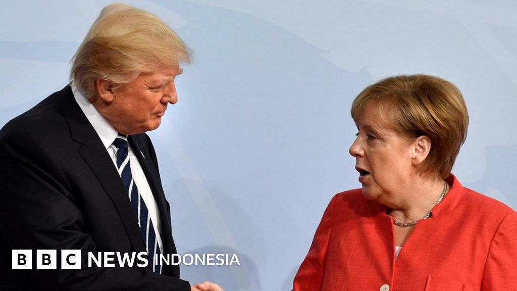 Keterangan gambar, Presiden Trump disambut oleh Kanselir Jerman, Angela Merkel dalam pembukaan KTT G20.