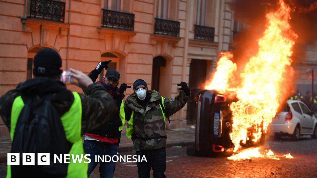 Para pengunjuk rasa 'gilets jaunes '-disebut demikian karena mereka beraksi dengan mengenakan rompi kuning dengan visibilitas tinggi yang wajib ada di setiap kendaraan di Perancis.