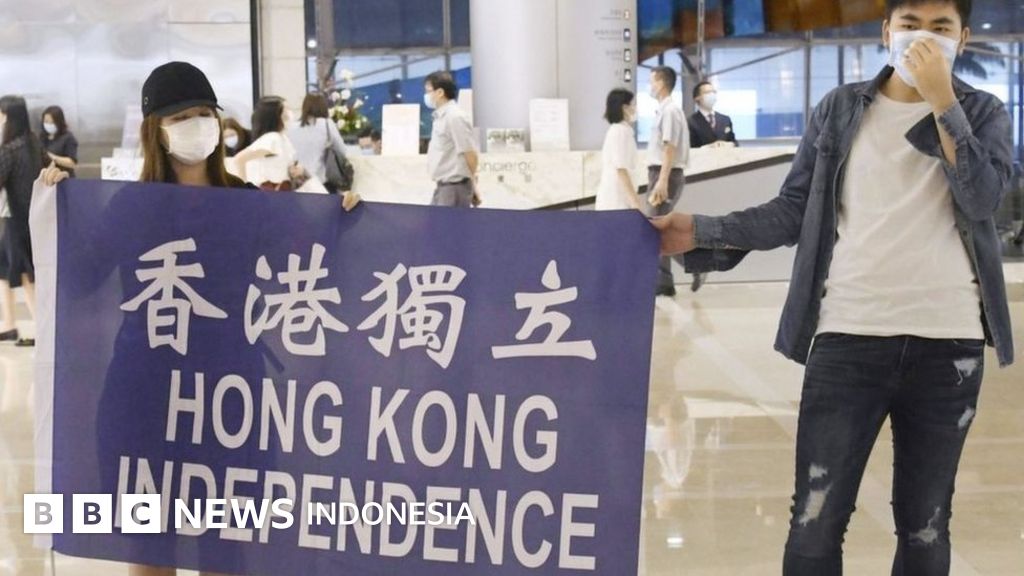 Keterangan gambar, Dua pemrotes membentangkan spanduk bertuliskan 'Hong Kong Independence' pada Senin (25/05) lalu.