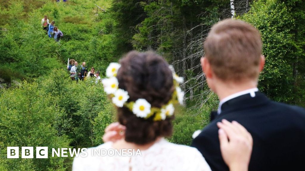 Sepasang pengantin asal Norwegia dan Swedia memutuskan menikah di perbatasan dua negara mereka - dengan para tamu yang berdiri di masing-masing sisi perbatasan wilayah, dengan pembatasan ketat Covid-19.