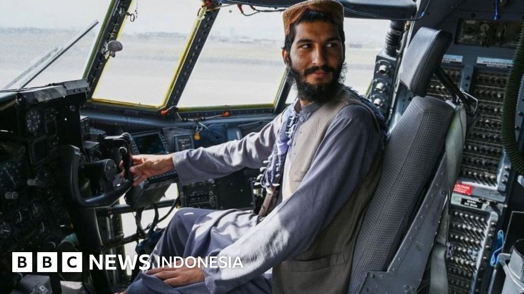 Foto-foto banyak bermunculan yang menunjukkan para petempur Taliban berpose dengan perlengkapan militer yang ditinggalkan oleh pasukan Amerika Serikat di bandara internasional Hamid Karzai, Kabul, Afghanistan.