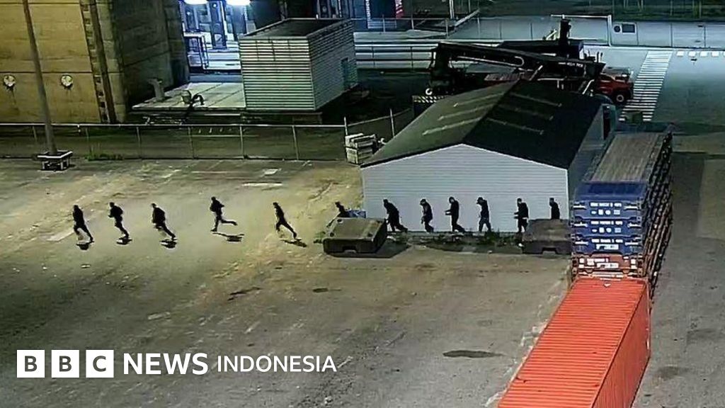 Melalui layar kamera pemantau alias CCTV, sejumlah orang tampak berlari layaknya pasukan militer menuju sebuah kapal kontainer di Pelabuhan Rotterdam. Mereka menggunakan pakaian gelap sehingga tampak seperti bayangan.