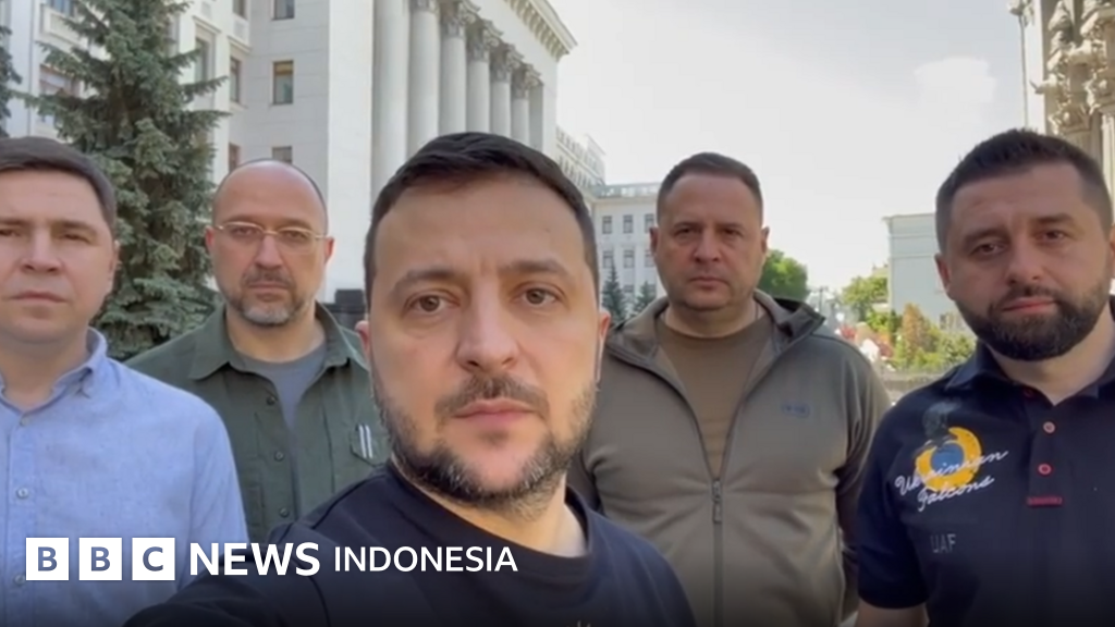 Zelensky berbicara di luar istana kepresidenan di Kyiv, sambil diapit oleh para penasihat dekatnya, menggemakan lagi pesan dalam video yang pernah direkamnya di awal perang ini dimulai.