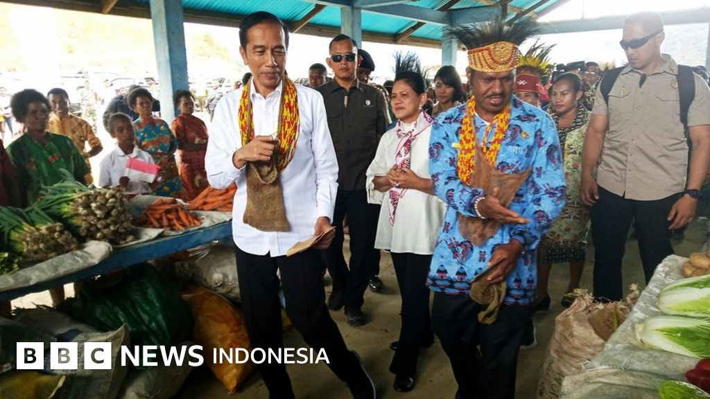 Keterangan gambar, Presiden Joko Widodo bersama Ibu Negara Iriana Joko Widodo meninjau pasar khusus Mama Papua di Distrik Anggi, Kabupaten Pegunungan Arfak, Papua Barat, Minggu (27/10). Kunjungan perdana presiden setelah pelantikan yang berlangsung sepekan lalu itu bertujuan untuk meninjau infrastruktur sekaligus menyampaikan rencana pembangunan di Papua Barat dan Papua dalam masa lima tahun mendatang.
