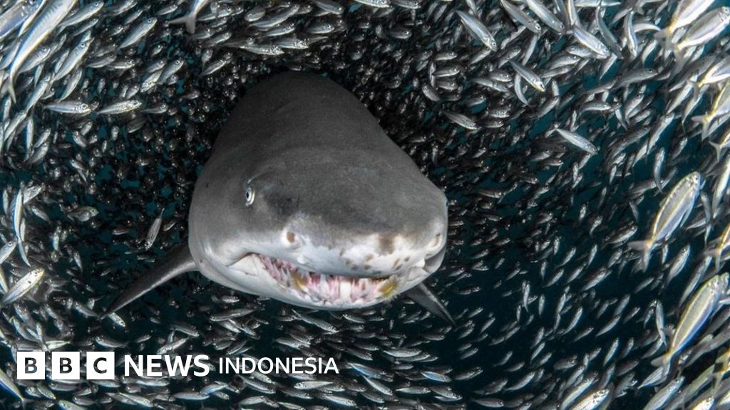 Fotografer bawah laut Tanya Houppermans telah menangkap gambar hiu ini menyeruak melewati 'bola umpan' yang tebal — formasi sekelompok ikan untuk mempertahankan diri ketika diserang.