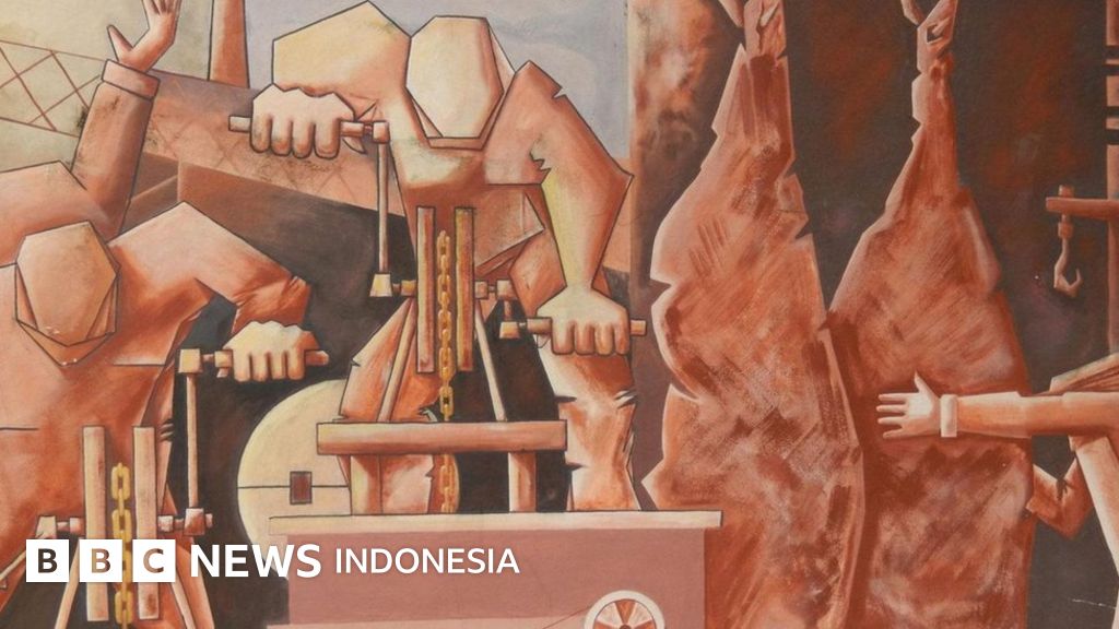 Para pekerja dari lebih 60 negara terserap di pekerjaan-pekerjaan yang disediakan oleh pabrik pengolahan daging di Fray Bentos, digambarkan pada sebuah mural oleh Angel Juárez Masares