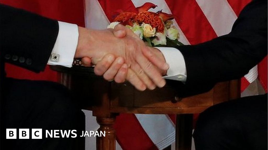 - しかしその数日後に会談したカナダのジャスティン・トルドー首相は、大統領の肩をがしりと握り、引っ張られないようにした。