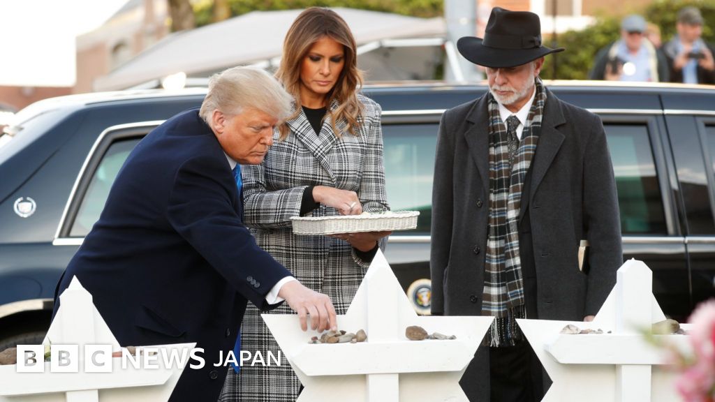 大統領一家がシナゴーグを訪れると、ジェフリー・マイヤーズ師が迎え入れた。外に用意された慰霊碑にメラニア夫人が花束を手向け、犠牲者1人1人の名前を刻んだ墓標にトランプ氏はひとつずつ小石を載せた。