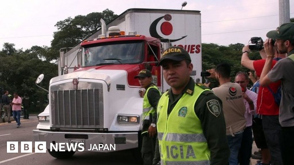 食糧と医薬品を積んだ複数のトラックが7日、隣国コロンビア・ククタの支援物資集配施設に到着した。コロンビア警察がバイクで護衛した。